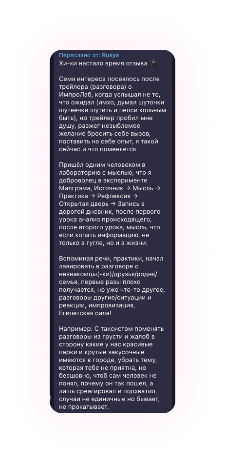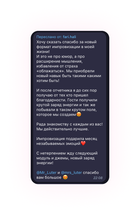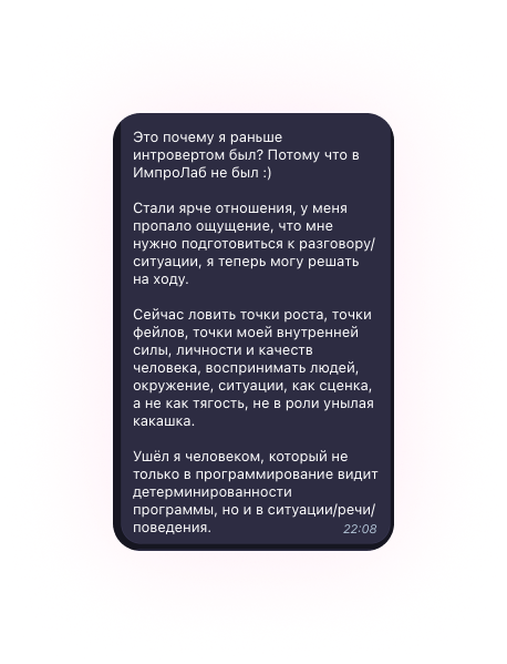 Если до сих пор кажется, что это не про тебя – это про тебя. Импровизация не ограничивается стенами учебных кабинетов. На постоянной основе команда ImproLab организовывает яркие вечеринки, лагеря для взрослых – ImproCamp, и путешествия, например, мы вместе покоряли вершины Эльбруса.