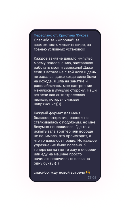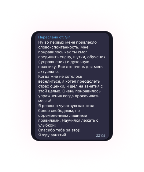 На занятии ты будешь делать то, что никогда не делал – пойдешь в новый опыт в безопасной среде, и увидишь, как страх оценки может превратиться в любопытство и интерес.